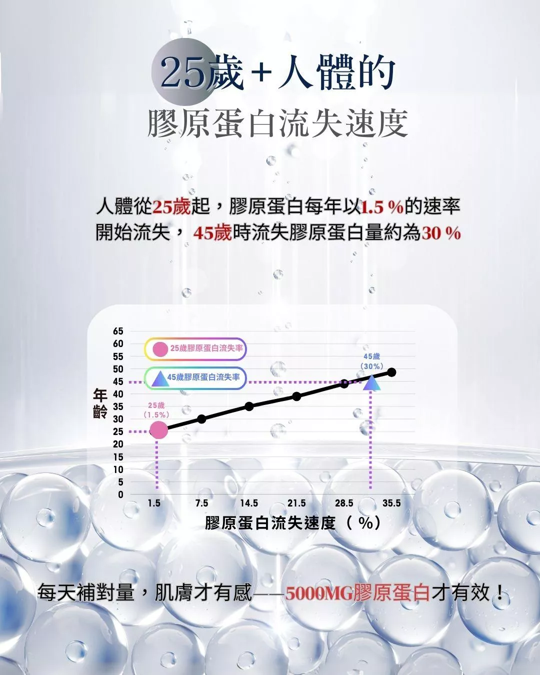 魚膠原蛋白:有效劑量 每日 5600mg, 平均<1000 Da分子,吸收率高、膚感明顯。