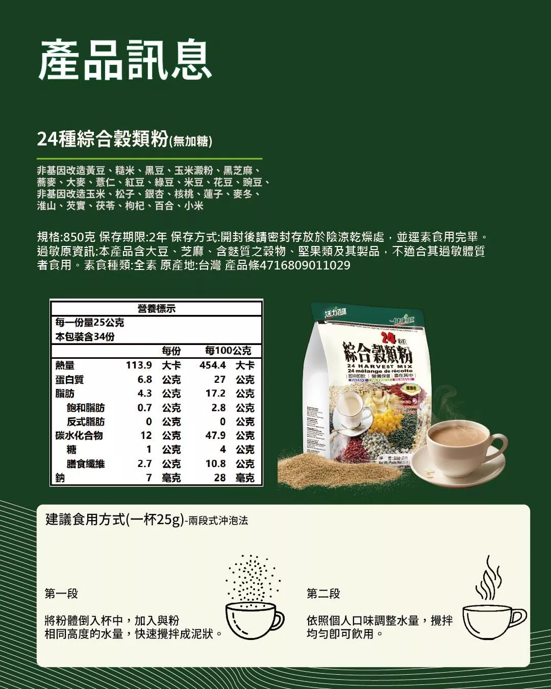 追求無糖生活的理想選擇!健康時代「24種綜合穀類粉」採用無糖配方,完整保留 24 種天然穀物的膳食纖維與營養。不添加砂糖、人工香料與防腐劑,口感自然醇厚。適合控糖族、銀髮族與全素食者,可單獨沖泡或加入豆漿牛奶,讓您天天補充多樣化穀物能量,健康無負擔。