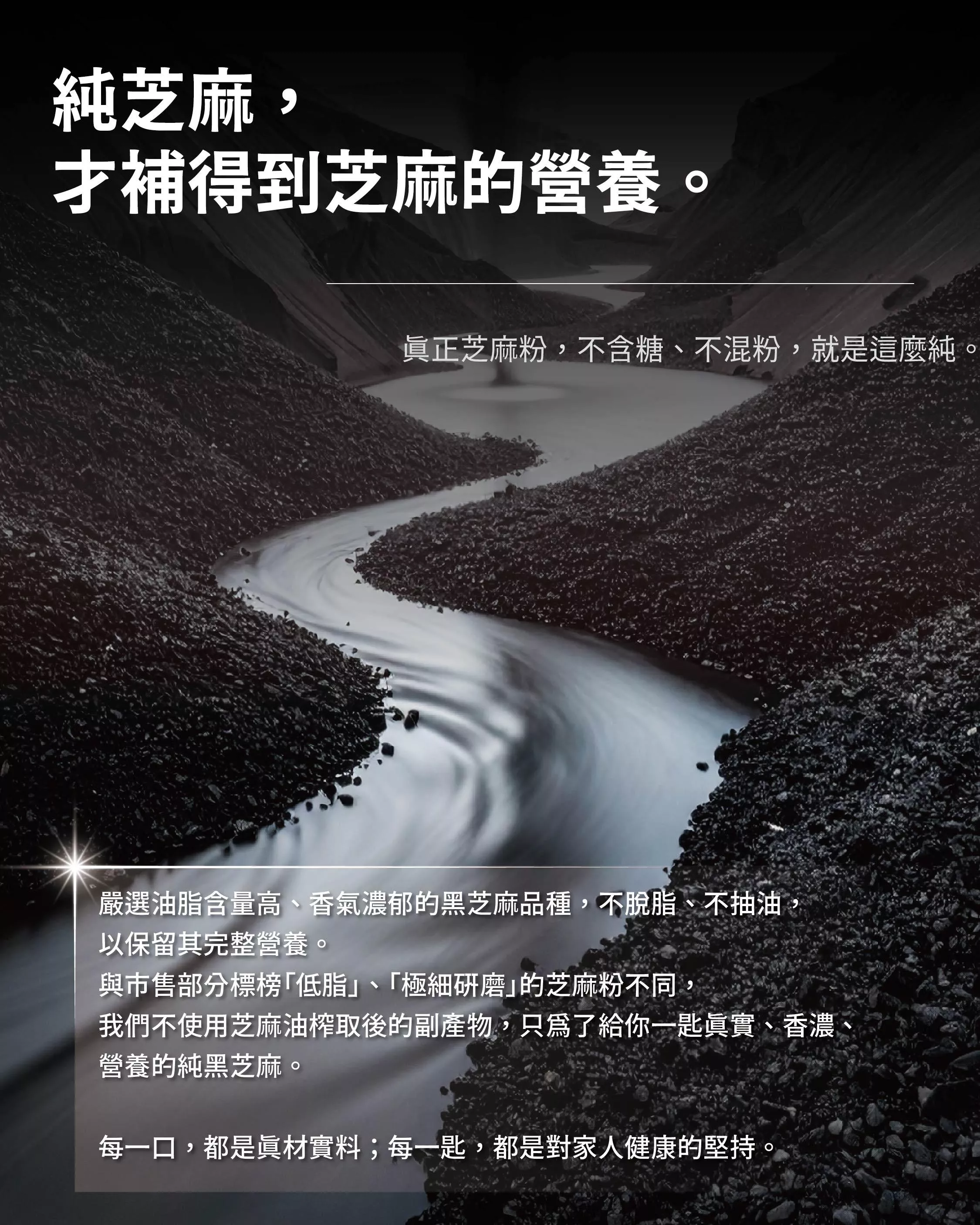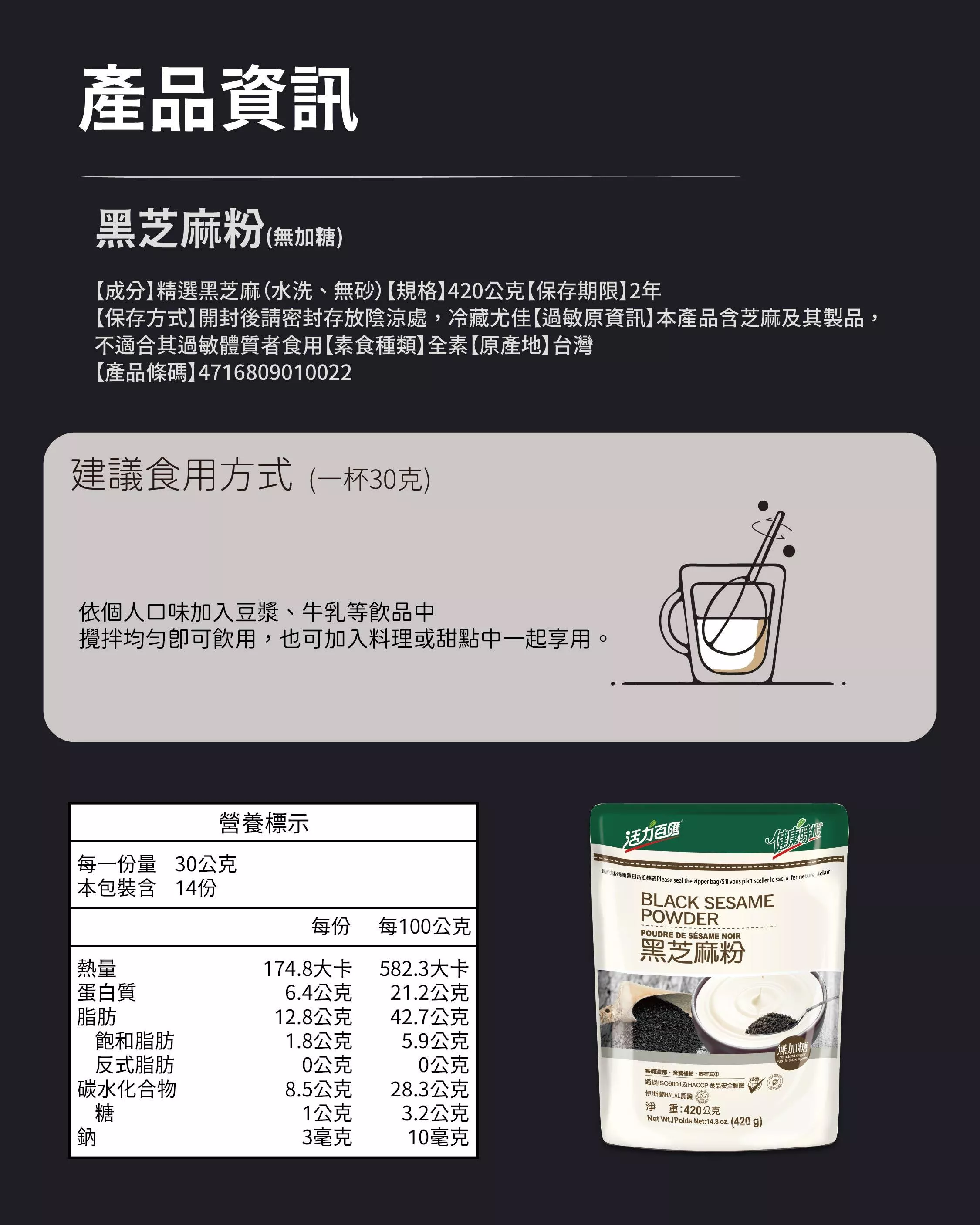 本品係使用上選黑芝麻經水洗、去砂處理後,以低溫烘焙,再經過三道研粉處理,粉體細緻,容易消化,香氣濃郁。