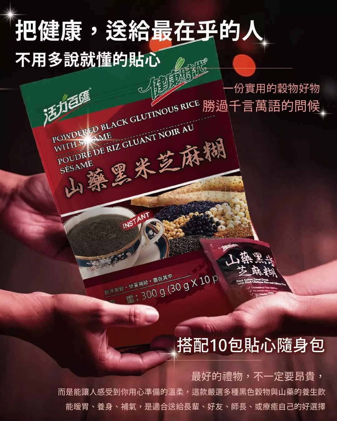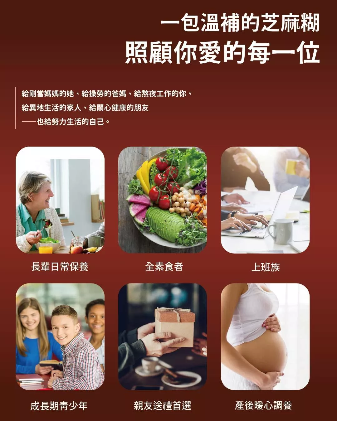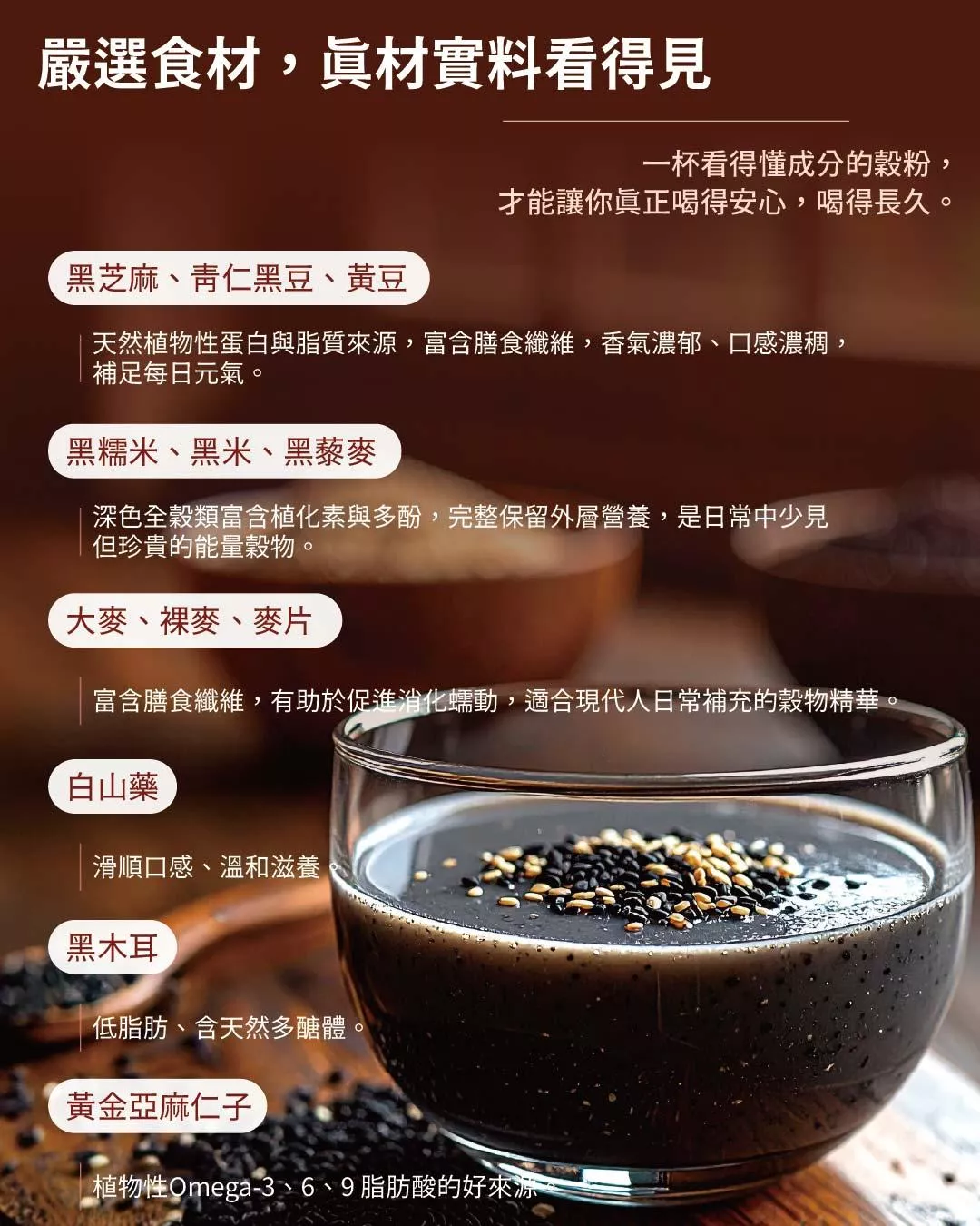 本產品係添加山藥、黑米等多種滋養配方調配而成,採用上等黑芝麻、水洗無沙,糊化效果佳,顆粒細微、不易沉澱、好消化、好吸收、營養不流失;口感香醇濃郁、甜而不膩,美味可口,老少咸宜。