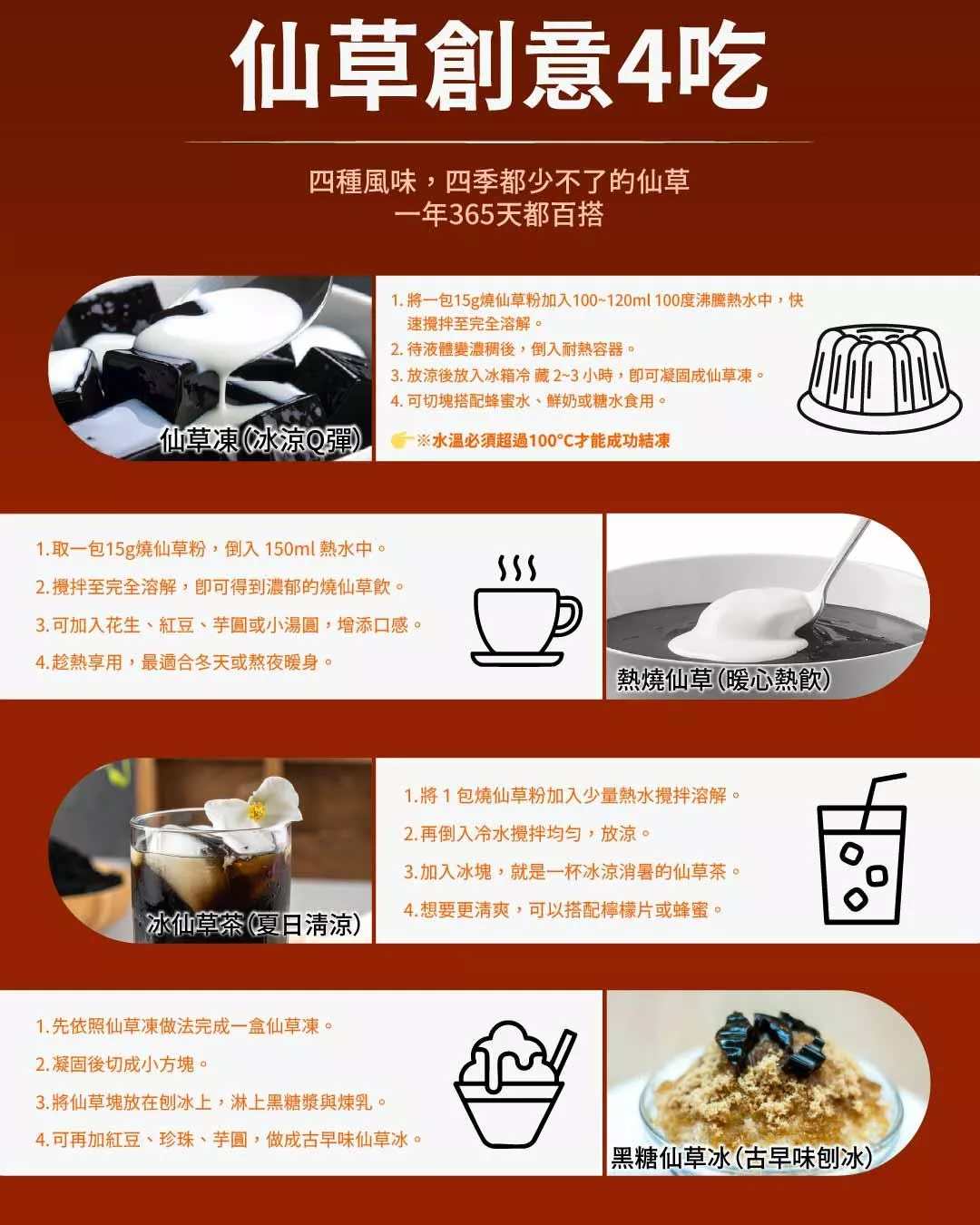 沖泡方式簡單方便,只需加入熱水攪拌均勻即可享用,隨時隨地都能品嚐到美味的燒仙草,快速又省時。